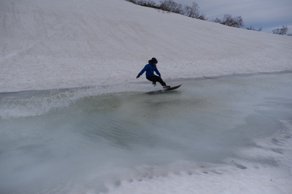 KR氏からシャクナゲ岳ではポンドスキムなる水上をスノーボードで滑る遊びが出来るらしいと教えられて興味津々。